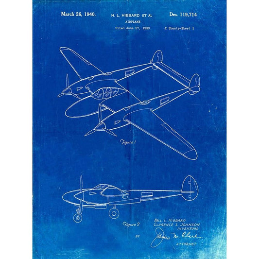 PP277-Faded Blueprint Lockheed P-38 Lightning Patent Poster Black Modern Wood Framed Art Print with Double Matting by Borders, Cole