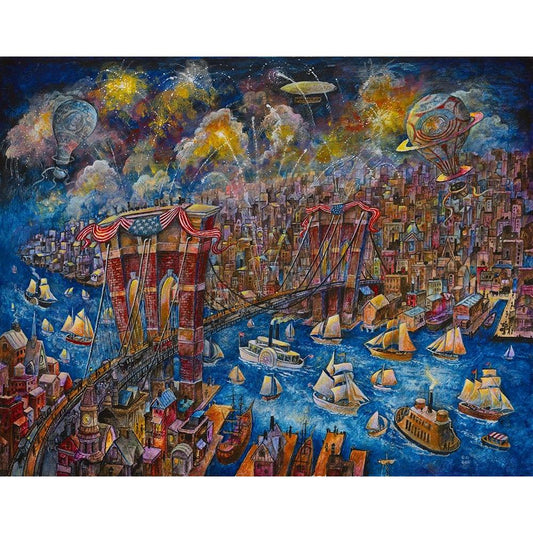 Opening Day 1873 Brooklyn Bridge Black Modern Wood Framed Art Print with Double Matting by Bell, Bill