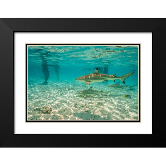French Polynesia- Bora Bora. Black-tip reef sharks near tourists. Black Modern Wood Framed Art Print with Double Matting by Jaynes Gallery