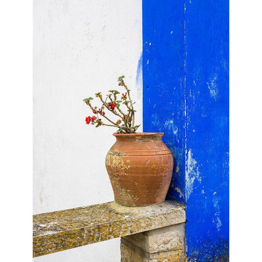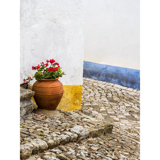 Portugal-Obidos-Red geranium growing in a terra cotta pot next to the entrance of a home in the his Black Modern Wood Framed Art Print with Double Matting by Eggers, Julie