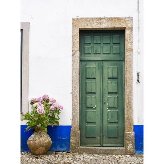 Portugal-Obidos-Pink hydrangea in terracotta pot next to a green door Black Modern Wood Framed Art Print with Double Matting by Eggers, Julie