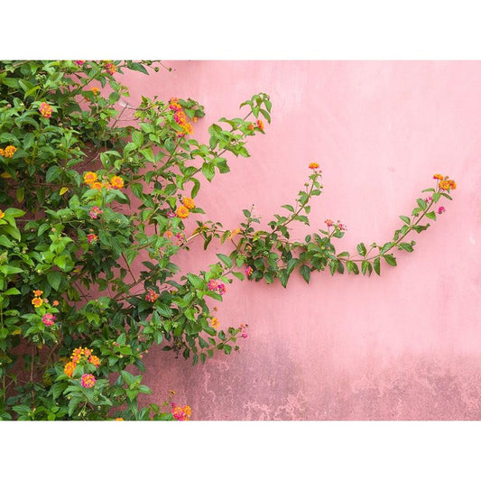 Portugal-Obidos-Colorful lantana vine growing against a pink wall Black Modern Wood Framed Art Print with Double Matting by Eggers, Julie