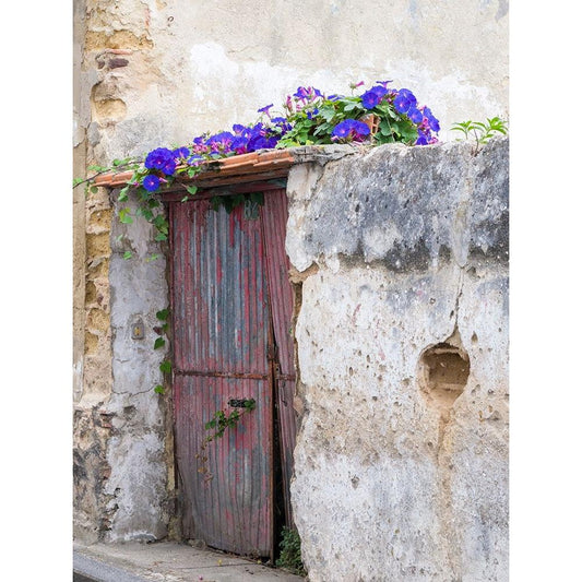 Portugal-Aveiro-Old red metal door with bright blue and pink morning glory flower vine covering abo Black Modern Wood Framed Art Print with Double Matting by Eggers, Julie