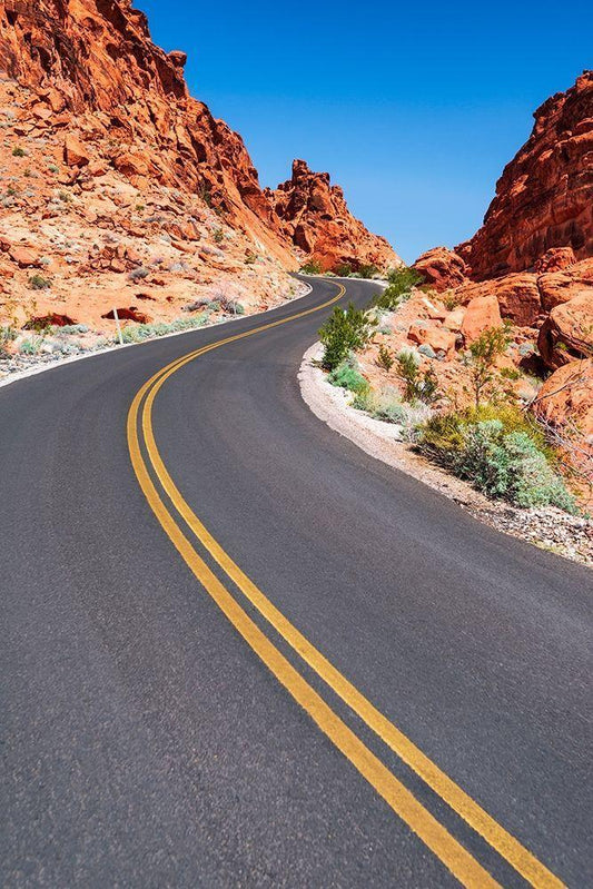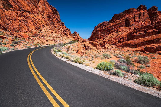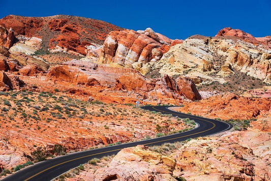 The park road winding through colorful sandstone-Valley of Fire State Park-Nevada-USA White Modern Wood Framed Art Print with Double Matting by Bishop, Russ