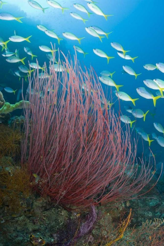 Indonesia Yellowtail fusilier and sea whip coral White Modern Wood Framed Art Print with Double Matting by Shimlock, Jones