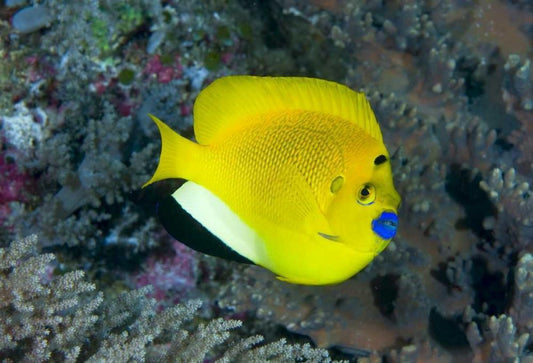 Indonesia Three spot angelfish swims amid coral White Modern Wood Framed Art Print with Double Matting by Shimlock, Jones