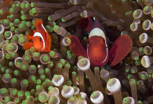 Two Clownfish among anemone tentacles, Indonesia White Modern Wood Framed Art Print with Double Matting by Shimlock, Jones