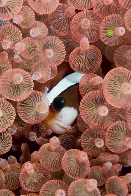 Indonesia A Clarks anemonefish peeking out White Modern Wood Framed Art Print with Double Matting by Shimlock, Jones