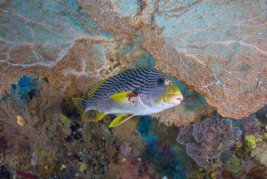 Indonesia Lined sweetlip fish and sea fan coral White Modern Wood Framed Art Print with Double Matting by Shimlock, Jones