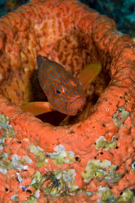 Indonesia, Raja Ampat Coral trout hides in coral White Modern Wood Framed Art Print with Double Matting by Shimlock, Jones