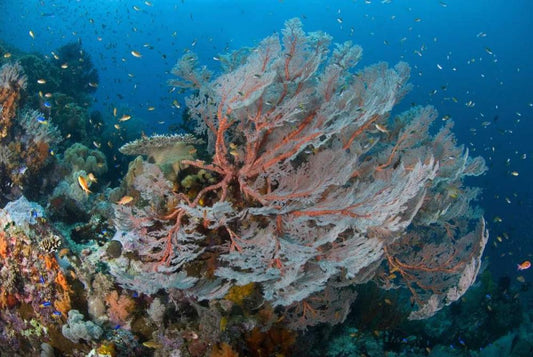 Indonesia, Papua Reef with large seafan and Fish White Modern Wood Framed Art Print with Double Matting by Shimlock, Jones