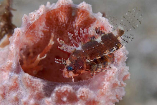 Indonesia Zebra fish atop a tube sponge White Modern Wood Framed Art Print with Double Matting by Shimlock, Jones