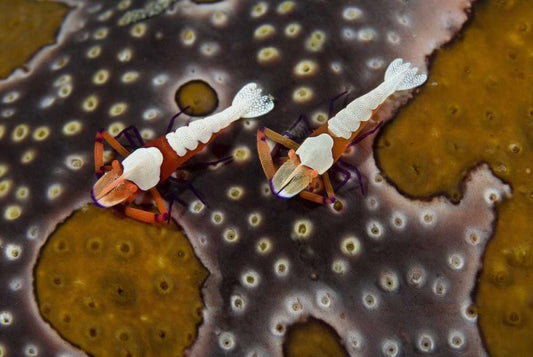 Indonesia Imperial shrimps on a sea cucumber White Modern Wood Framed Art Print with Double Matting by Shimlock, Jones