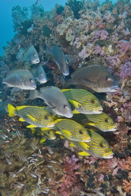 Indonesia,Triton Bay Schooling fish and coral White Modern Wood Framed Art Print with Double Matting by Shimlock, Jones
