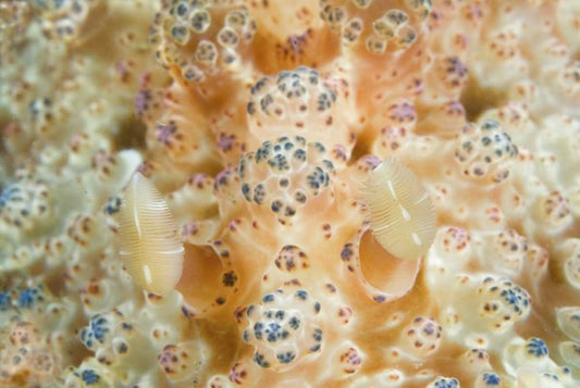 Indonesia, Sulawesi Isl Two nudibranch on coral White Modern Wood Framed Art Print with Double Matting by Shimlock, Jones