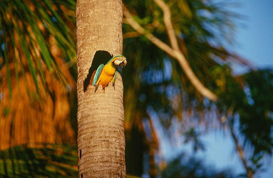 Blue-and-Yellow Macaw perched in trunk nest cavity-Peru White Modern Wood Framed Art Print with Double Matting by Garber, Howie