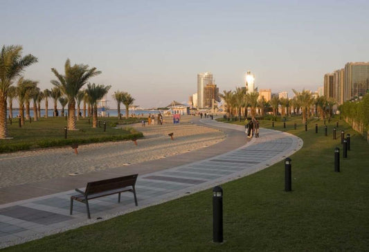 UAE, Abu Dhabi Walkway by beach and waterfront White Modern Wood Framed Art Print with Double Matting by Young, Bill