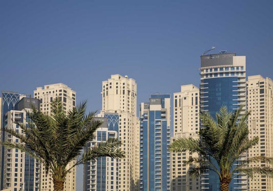 UAE, Dubai Towers of Jumeirah Beach Residence White Modern Wood Framed Art Print with Double Matting by Young, Bill