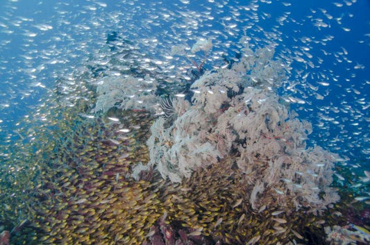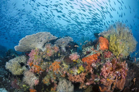Indonesia, Komodo NP Fish schooling over a reef White Modern Wood Framed Art Print with Double Matting by Shimlock, Jones