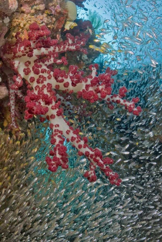 Baitfish around soft coral, Papua, Indonesia White Modern Wood Framed Art Print with Double Matting by Shimlock, Jones