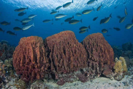 Indonesia, Papua Fish swims over three sponges White Modern Wood Framed Art Print with Double Matting by Shimlock, Jones