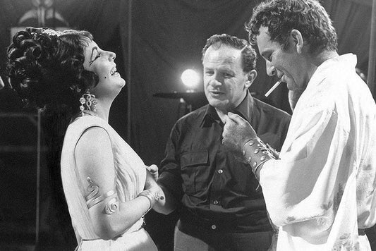 Cleopatra - Elizabeth Taylor on set with Richard Burton and Joseph Mankiewicz White Modern Wood Framed Art Print with Double Matting by Hollywood Photo Archive