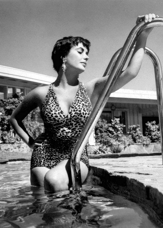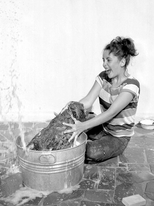 Elizabeth Taylor washing a dog White Modern Wood Framed Art Print with Double Matting by Hollywood Photo Archive