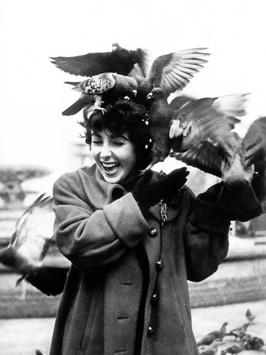 Elizabeth Taylor with pigeons White Modern Wood Framed Art Print with Double Matting by Hollywood Photo Archive