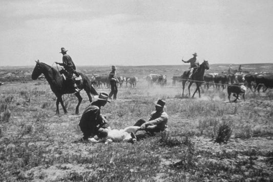 Cowboys working Calves White Modern Wood Framed Art Print with Double Matting by Vintage Photography