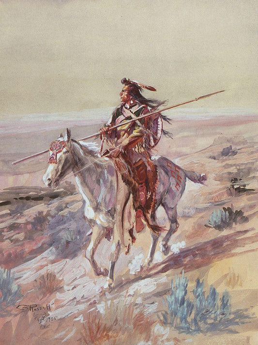 Indian with Spear White Modern Wood Framed Art Print with Double Matting by Russell, Charles Marion