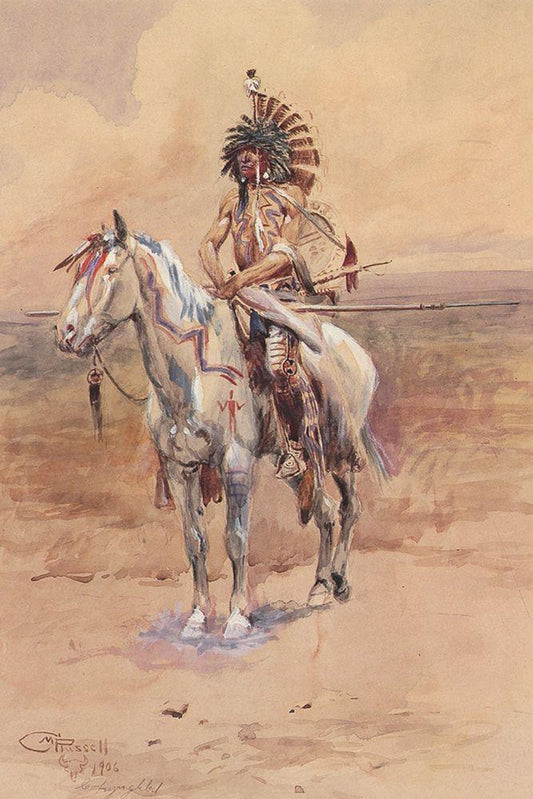 Mandan Warrior White Modern Wood Framed Art Print with Double Matting by Russell, Charles Marion