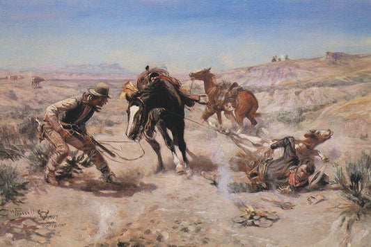 Roping a Wolf by the neck White Modern Wood Framed Art Print with Double Matting by Russell, Charles Marion