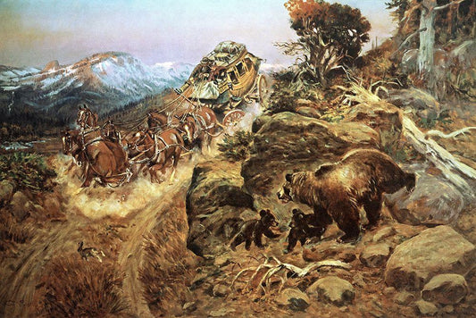 Stagecoach Attack White Modern Wood Framed Art Print with Double Matting by Russell, Charles Marion