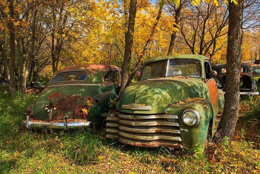 Canada-Manitoba-St Lupicin Vintage old vehicles in wrecking yard White Modern Wood Framed Art Print with Double Matting by Jaynes Gallery