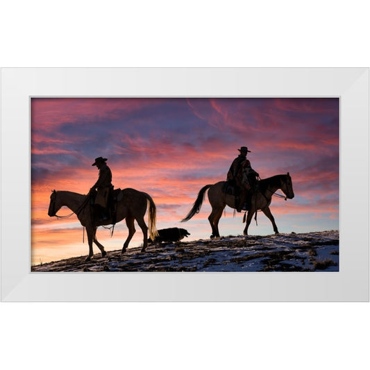 USA- Shell- Wyoming. Hideout Ranch cowgirls and dog silhouetted against sunsets sky. White Modern Wood Framed Art Print by Gulin, Darrell