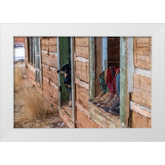 USA- Wyoming. Hideout Horse Ranch- boots on display. White Modern Wood Framed Art Print by Looney, Hollice