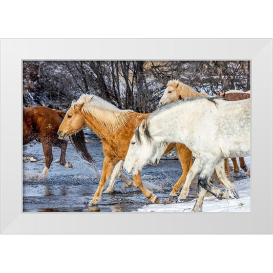 USA- Wyoming. Hideout Horse Ranch- horses crossing the stream. White Modern Wood Framed Art Print by Looney, Hollice