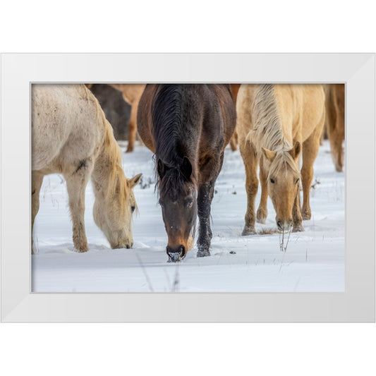 USA- Wyoming. Hideout Horse Ranch- horses grazing in the snow. White Modern Wood Framed Art Print by Looney, Hollice
