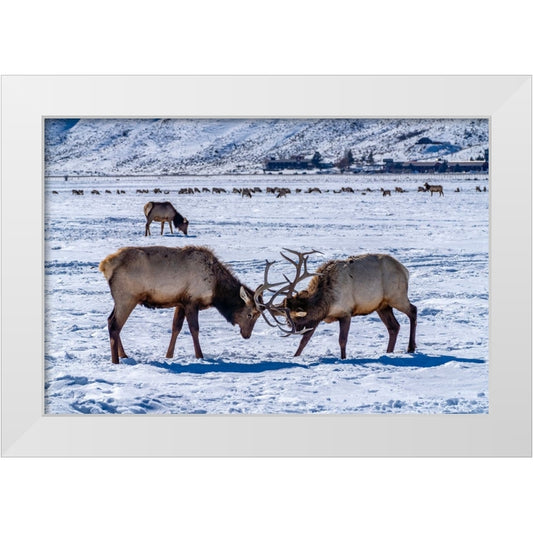USA- Wyoming- National Elk Refuge. Bull elks sparring. White Modern Wood Framed Art Print by Jaynes Gallery