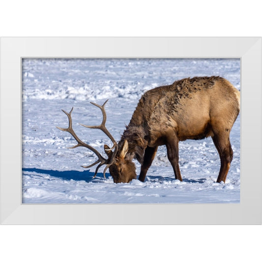 USA- Wyoming- National Elk Refuge. Bull elk seeking food beneath snow. White Modern Wood Framed Art Print by Jaynes Gallery