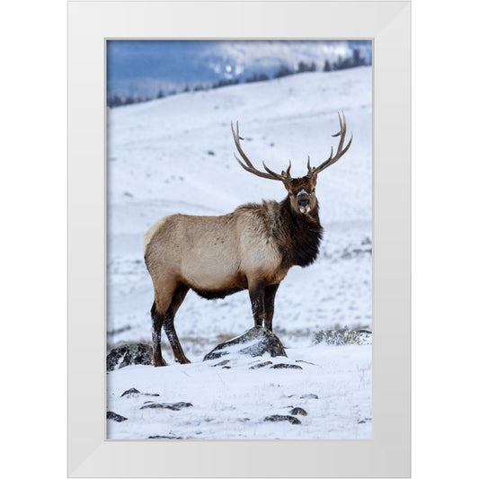 USA- Wyoming- Yellowstone National Park. Lone bull elk in snow White Modern Wood Framed Art Print by Gulin, Darrell