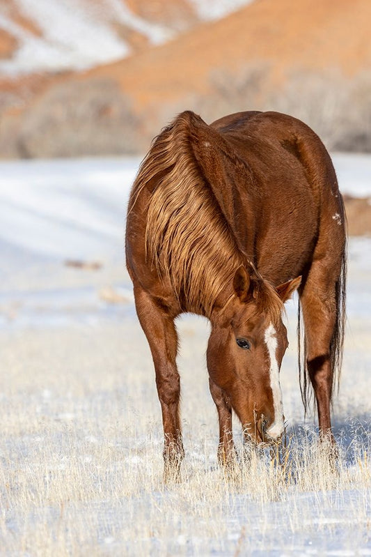 USA- Wyoming. Hideout Horse Ranch- horse grazing in snow. White Modern Wood Framed Art Print with Double Matting by Looney, Hollice