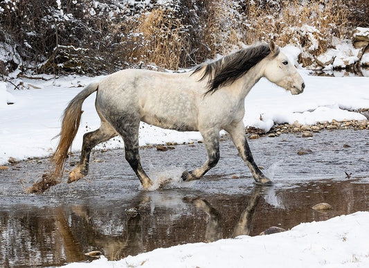 USA- Shell- Wyoming. Hideout Ranch horses in reflection Shell Creek. White Modern Wood Framed Art Print with Double Matting by Gulin, Darrell