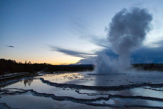 Sunset eruption of Great Fountain Geyser, Yellowstone National Park White Modern Wood Framed Art Print with Double Matting by The Yellowstone Collection