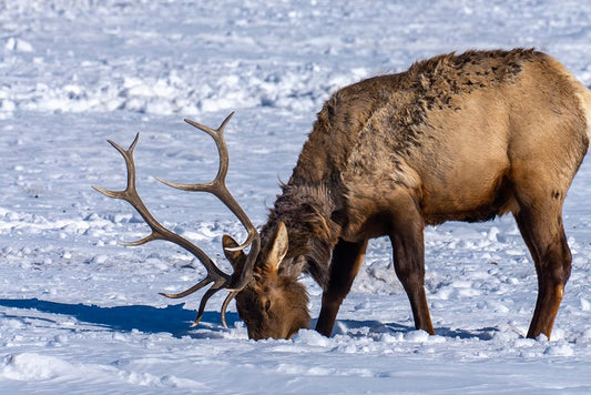 USA- Wyoming- National Elk Refuge. Bull elk seeking food beneath snow. White Modern Wood Framed Art Print with Double Matting by Jaynes Gallery