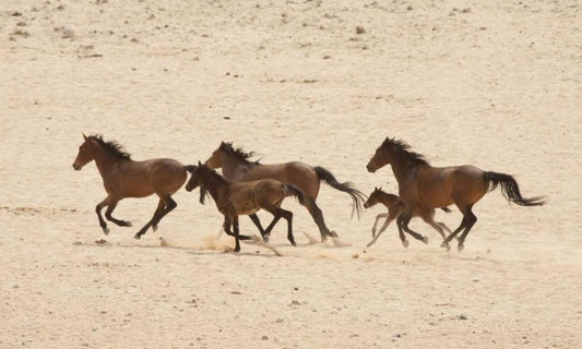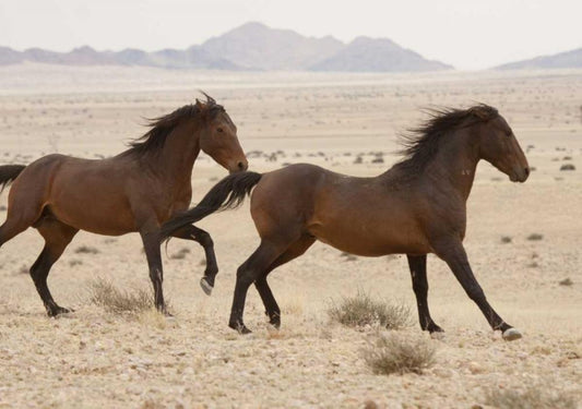 Namibia, Aus, Namib Desert Wild horses running White Modern Wood Framed Art Print with Double Matting by Kaveney, Wendy