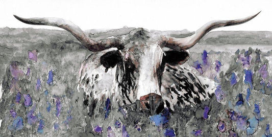 Longhorn in Flower Field White Modern Wood Framed Art Print with Double Matting by Stellar Design Studio