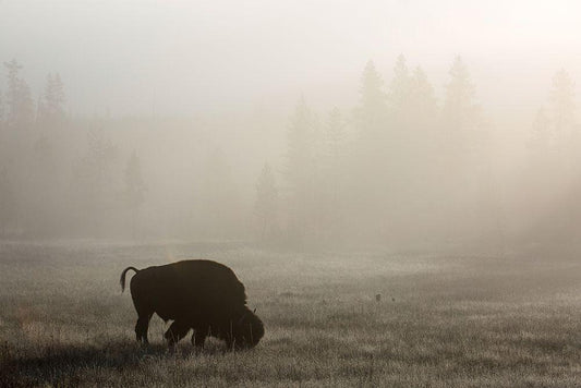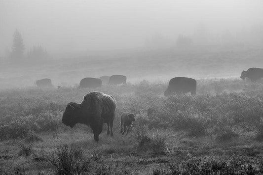 Bison in the fog, Swan Lake Flat, Yellowstone National Park White Modern Wood Framed Art Print with Double Matting by The Yellowstone Collection
