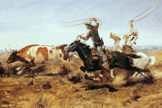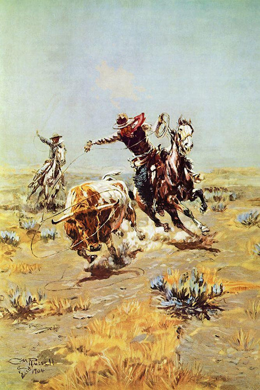 OH Cowboys Roping a Steer White Modern Wood Framed Art Print with Double Matting by Russell, Charles Marion