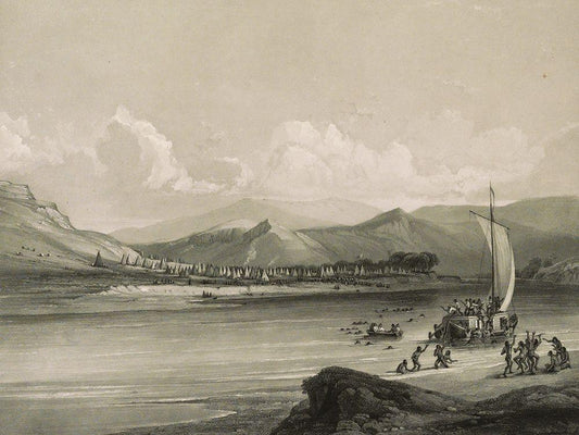 Punca Indians encamped on the banks of the Missouri White Modern Wood Framed Art Print with Double Matting by Bodmer, Karl